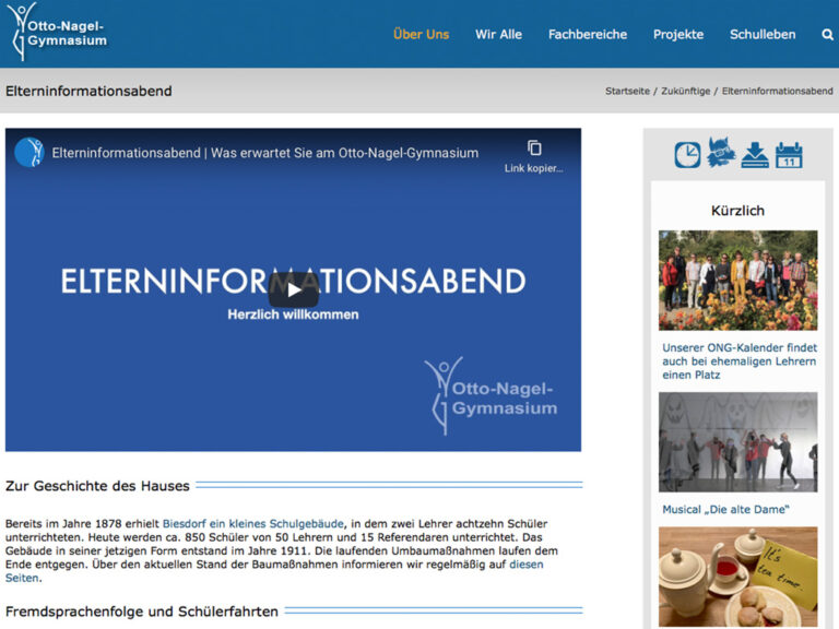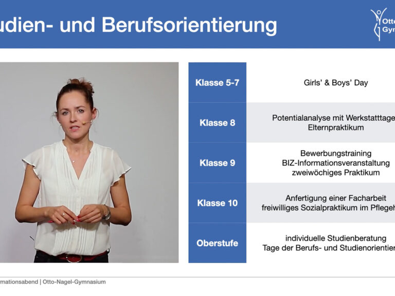 Aufgrund der geltenden Kontaktbeschränkungen ist es Schulen derzeit untersagt, Informationsveranstaltungen zu eigenen Schulprogrammen und Einstellungsverfahren anzubieten. Hierzu hat des Berliner Otto-Nagel-Gymnasium ein Informationsvideo erstellen lassen, welches zukünftigen Schülerinnen und Schülern aus Marzahn-Hellersdorf und Umgebung ein Bild der Schule verschaffen soll.